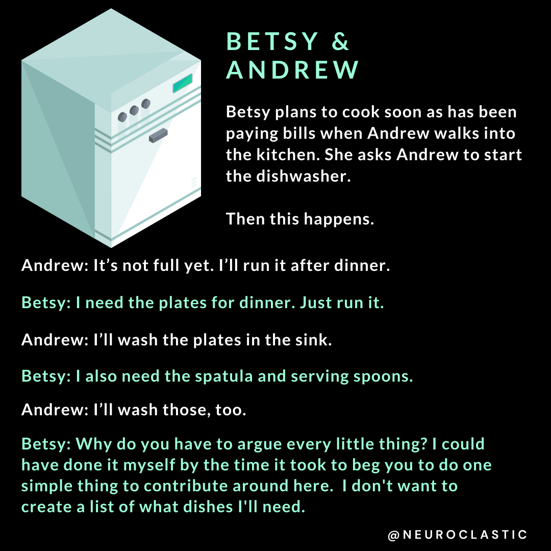 When the scenario was written, it was based off of a real incident between an autistic man and a non-autistic roommate, and Andrew was the fictional version of the man and Betsy was the fictional version of the woman. The scenario was taken from a woman complaining about how her roommate always wants to argue and was looking for advice.
