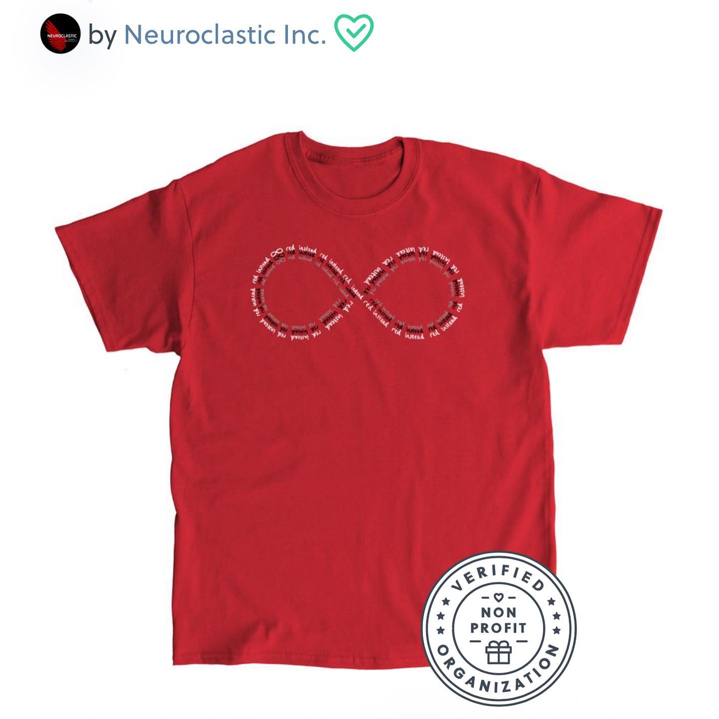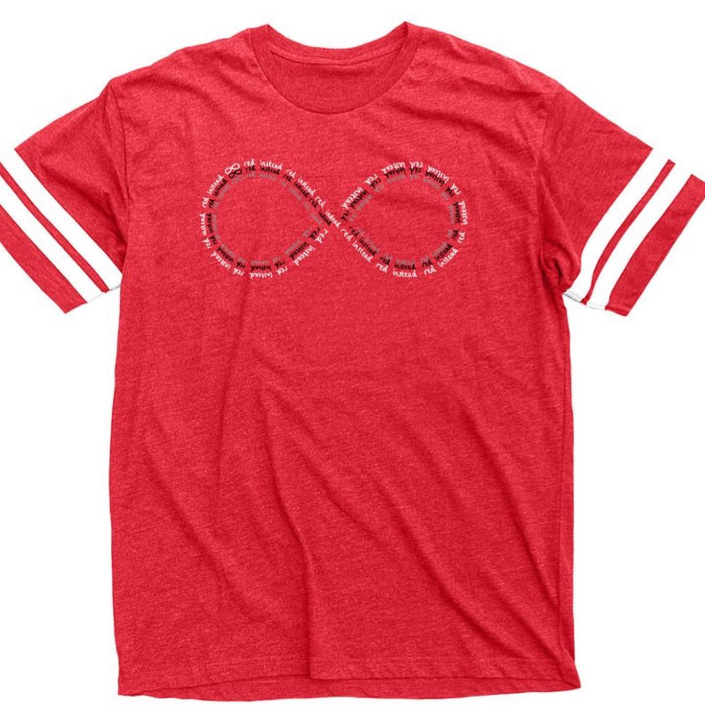 New shirt design ahead of April. Shout-out to Iqra for the art! Shirt is red with an infinity symbol made from words that read “Red Instead” in Black, white, and grey text.